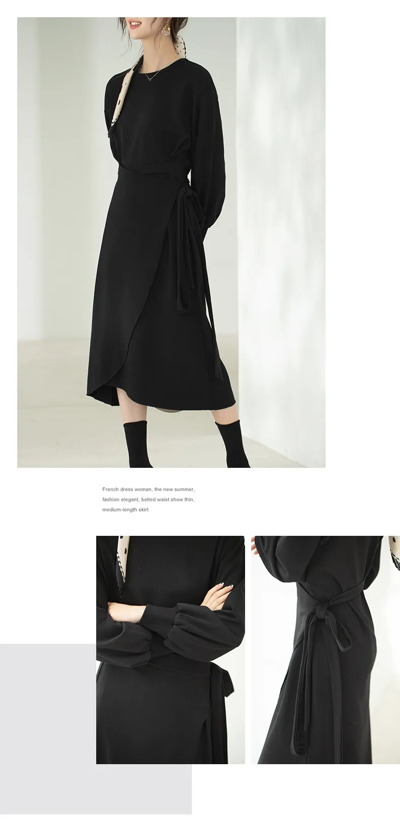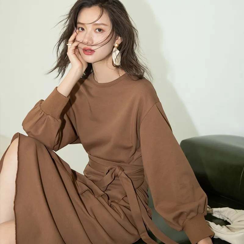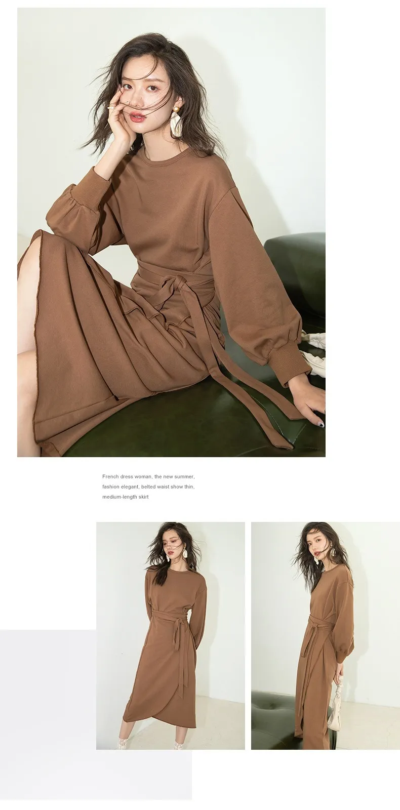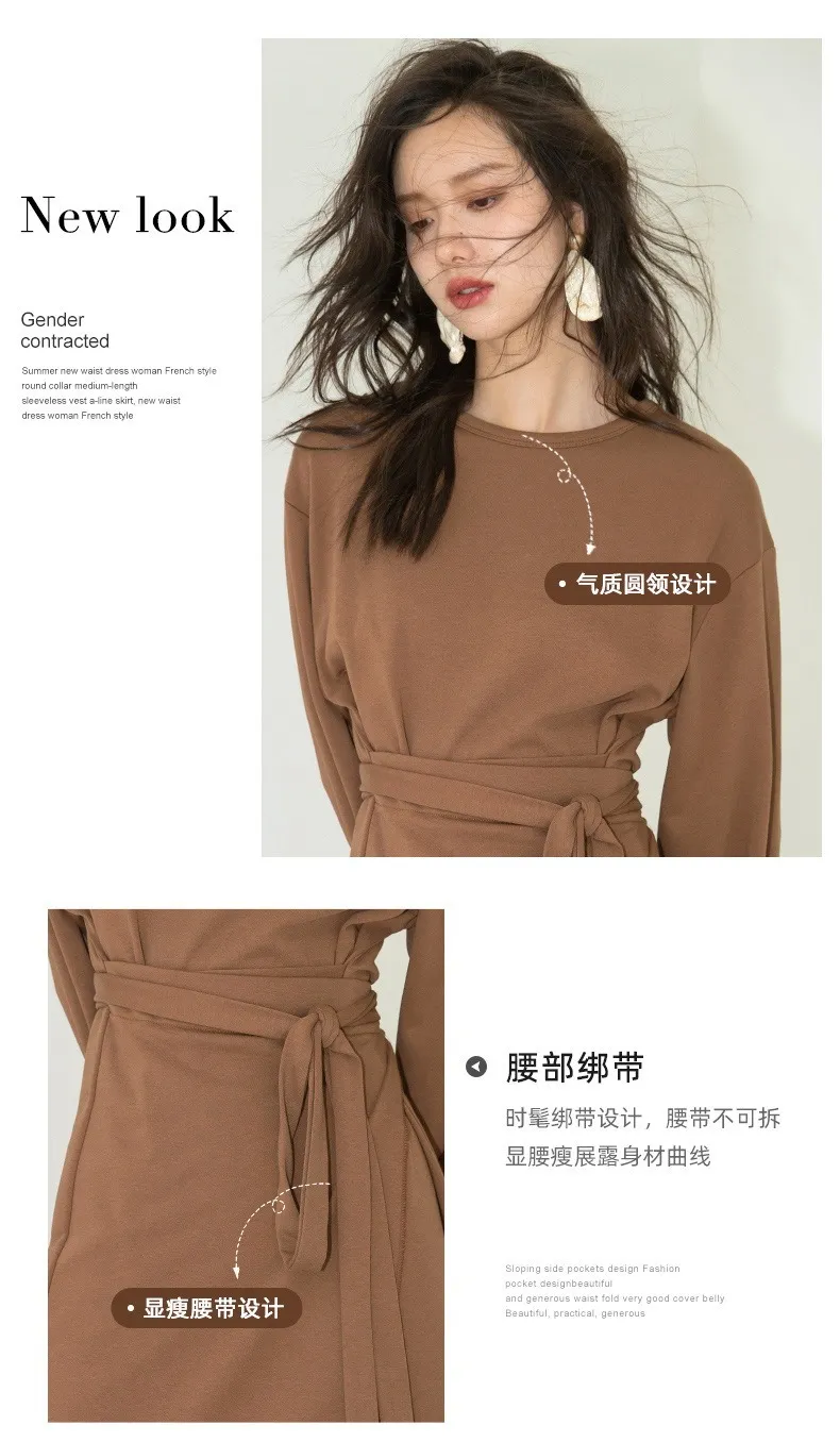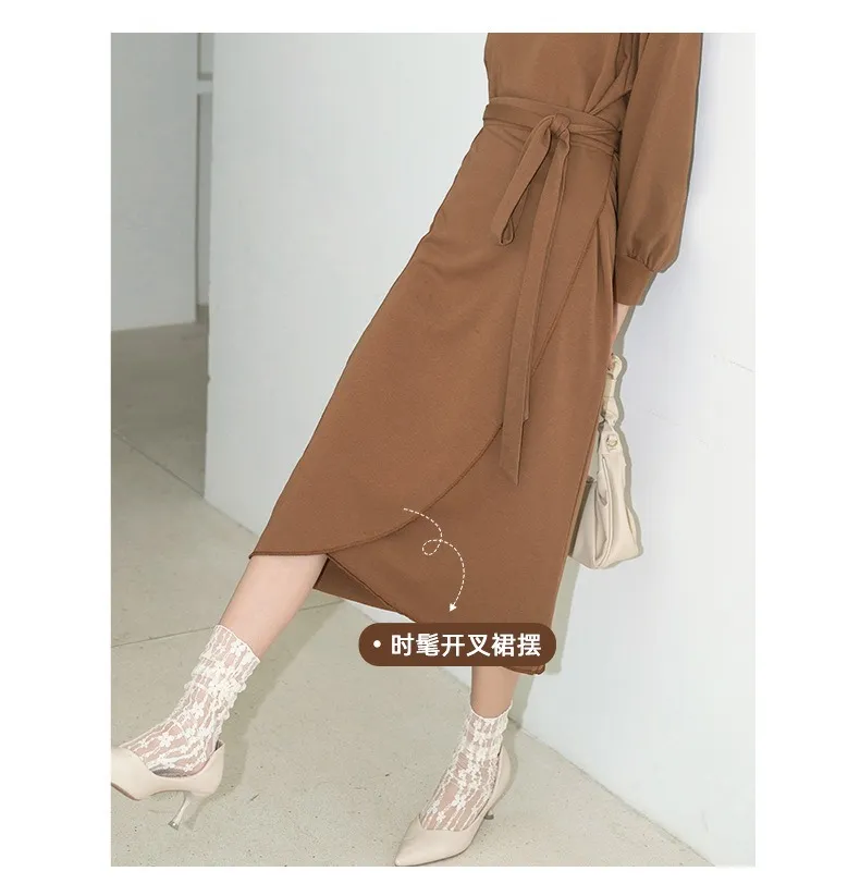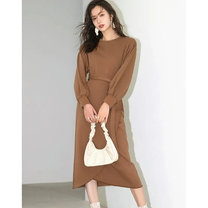 氣質開叉 收腰綁帶 圓領長袖連衣裙