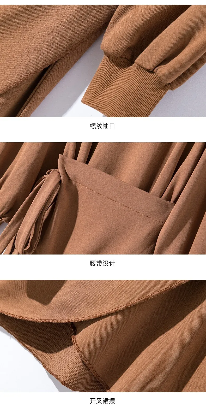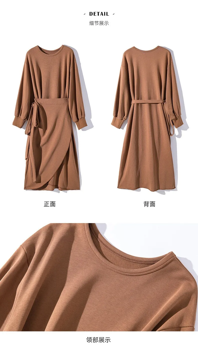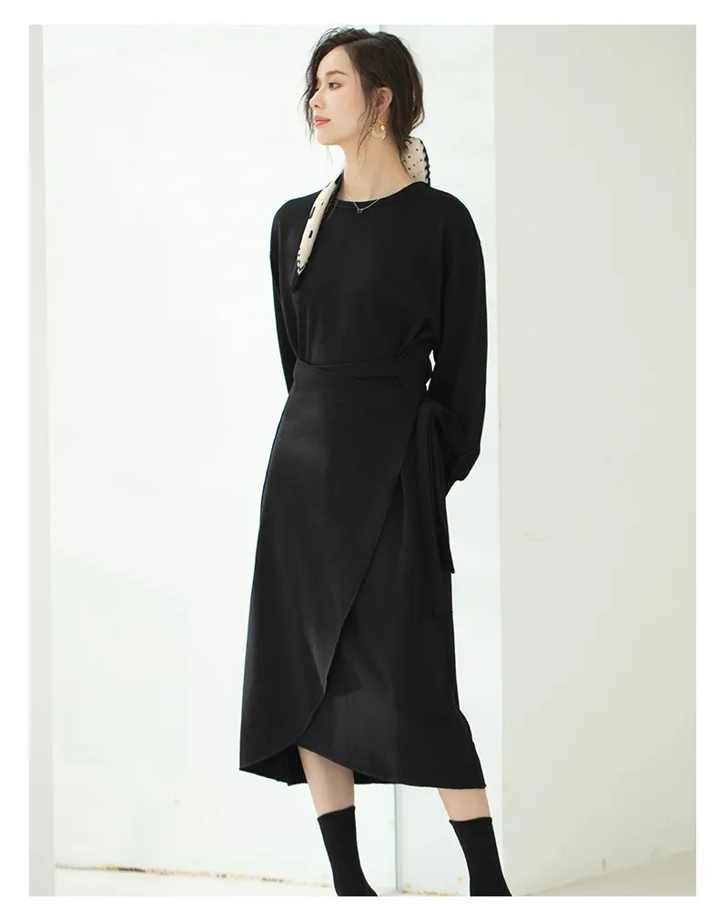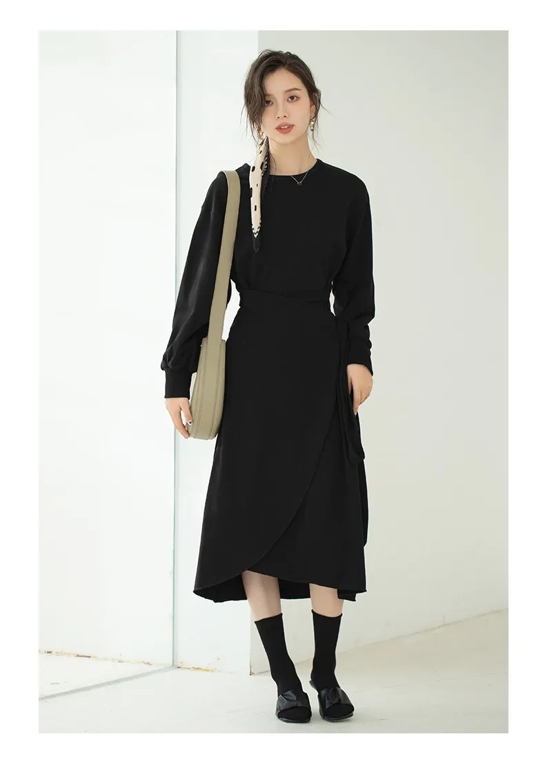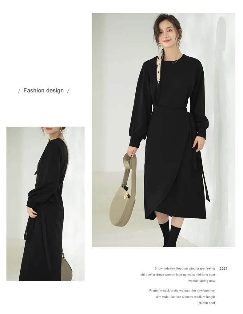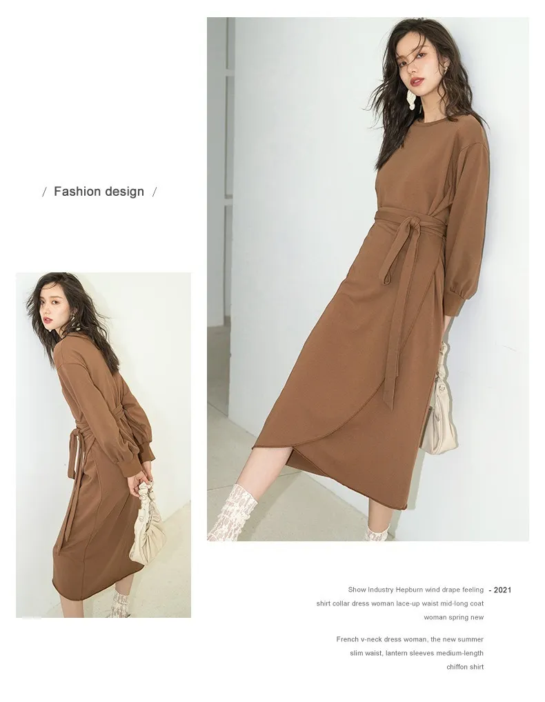 氣質開叉 收腰綁帶 圓領長袖連衣裙