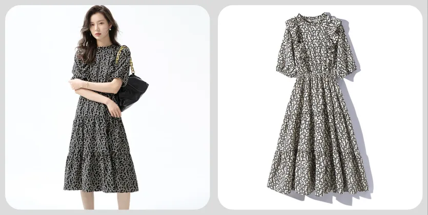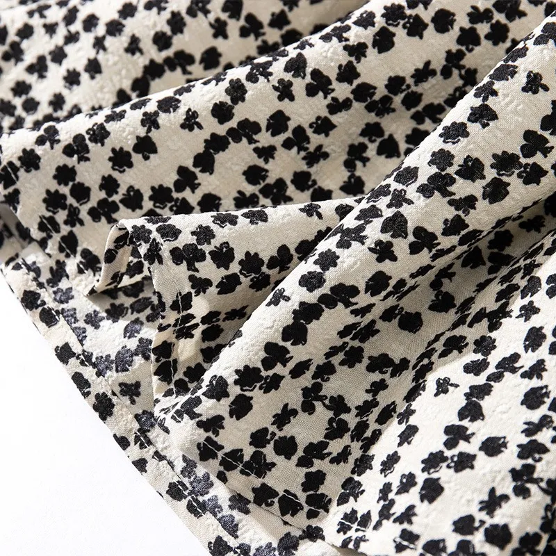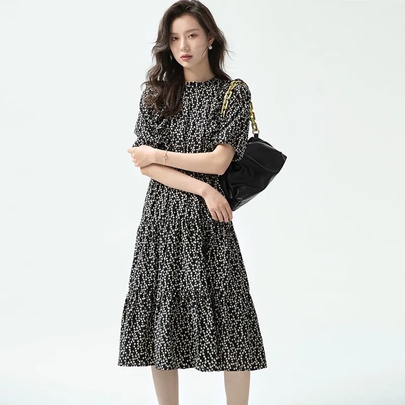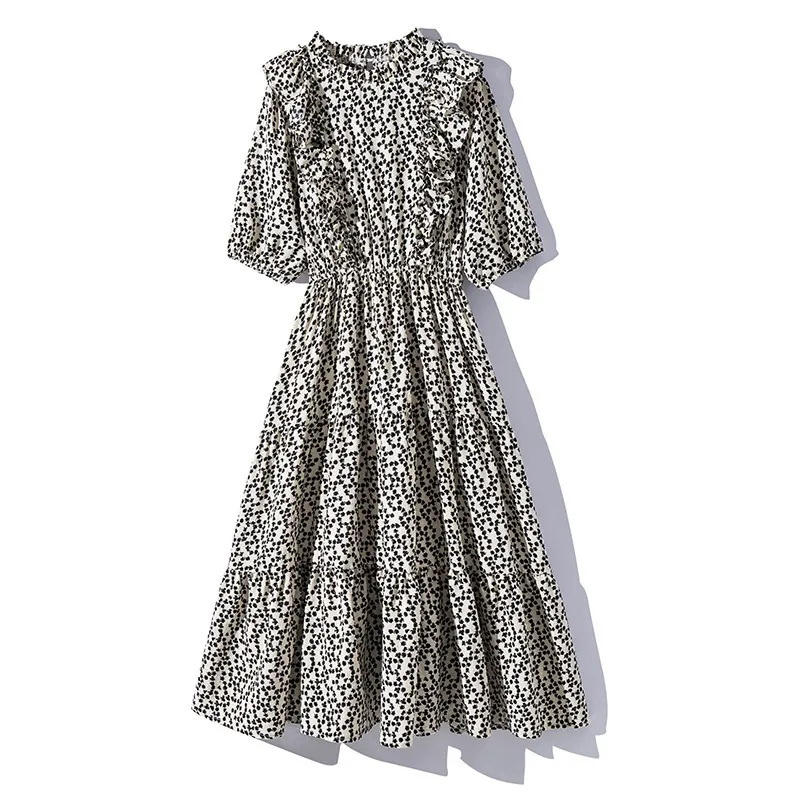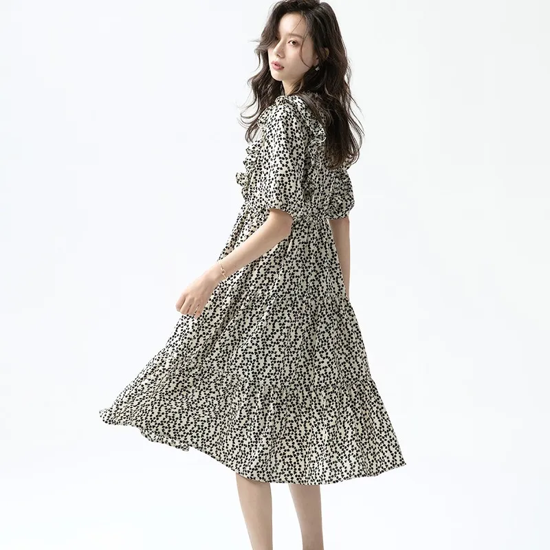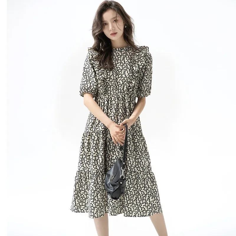 復古碎花連衣裙 法式氣質木耳邊 短袖收腰中長a字裙
