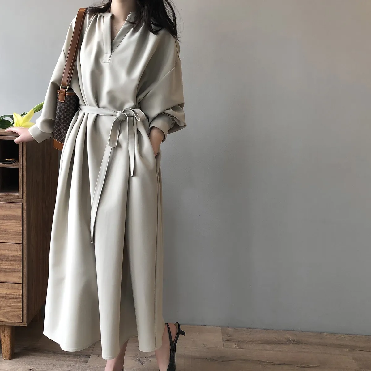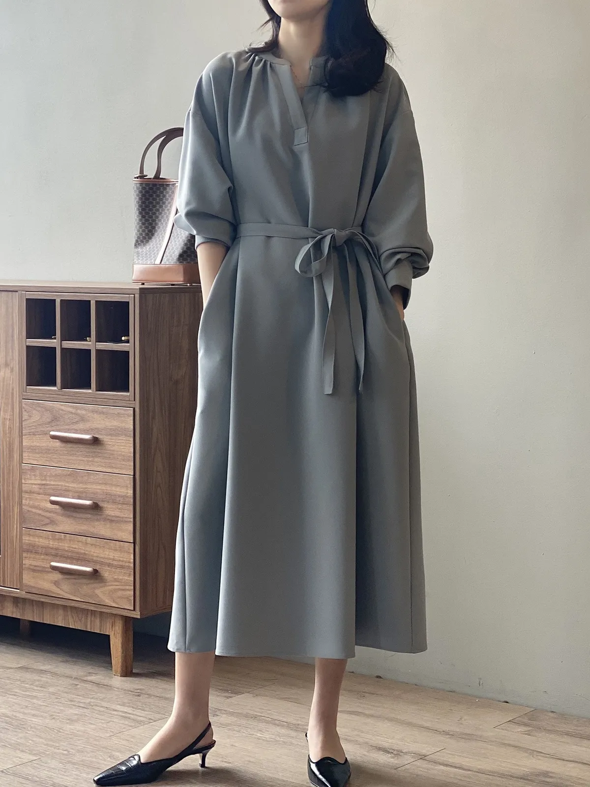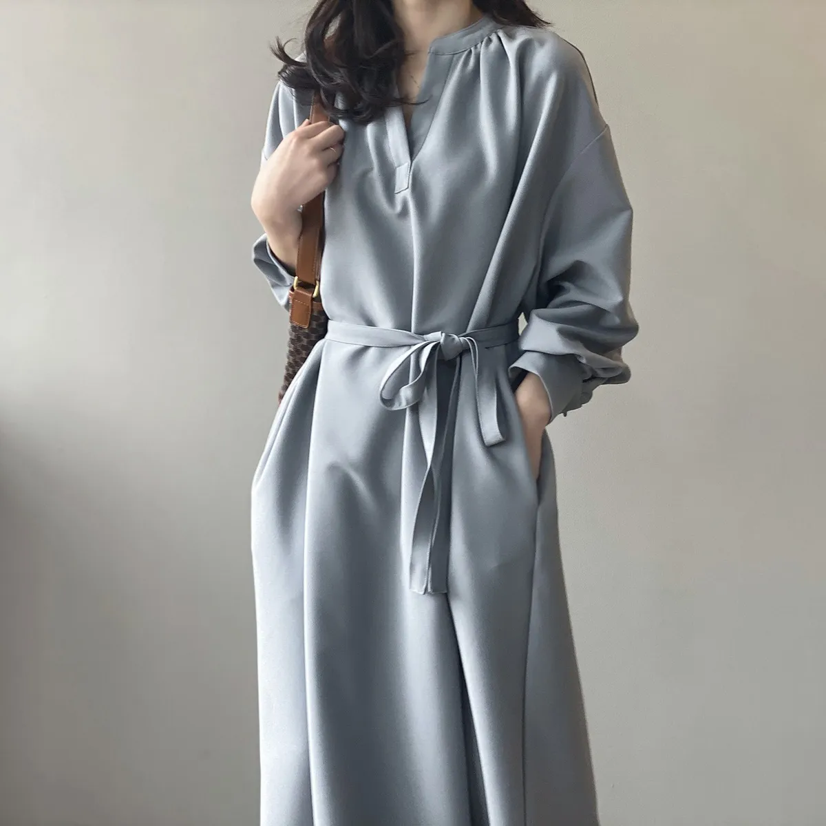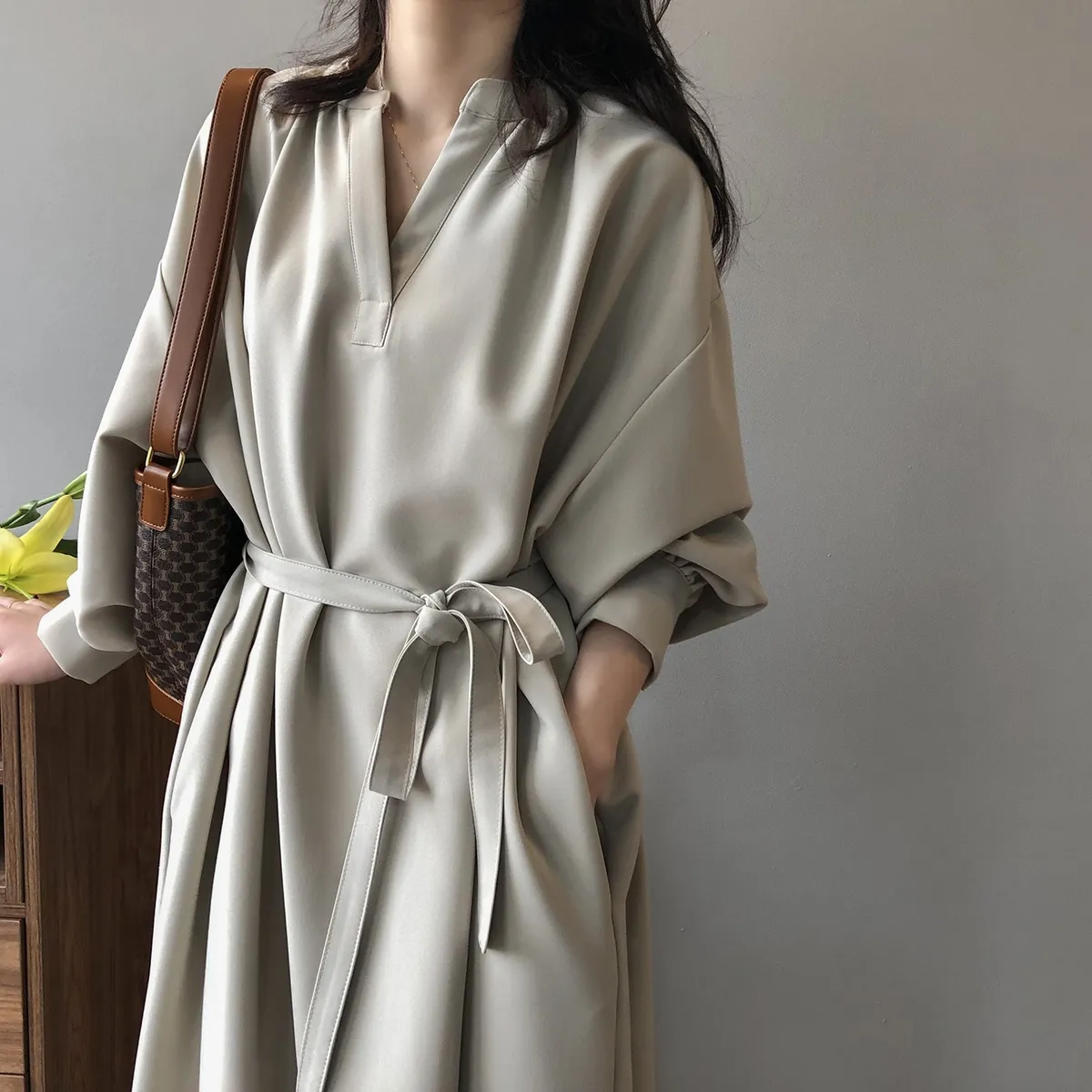 春季V領連衣裙最新韓版寬鬆優雅氣質系帶長款洋裝