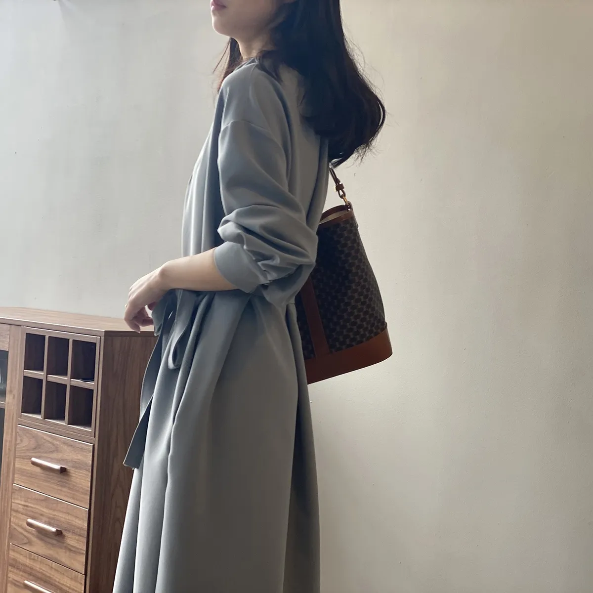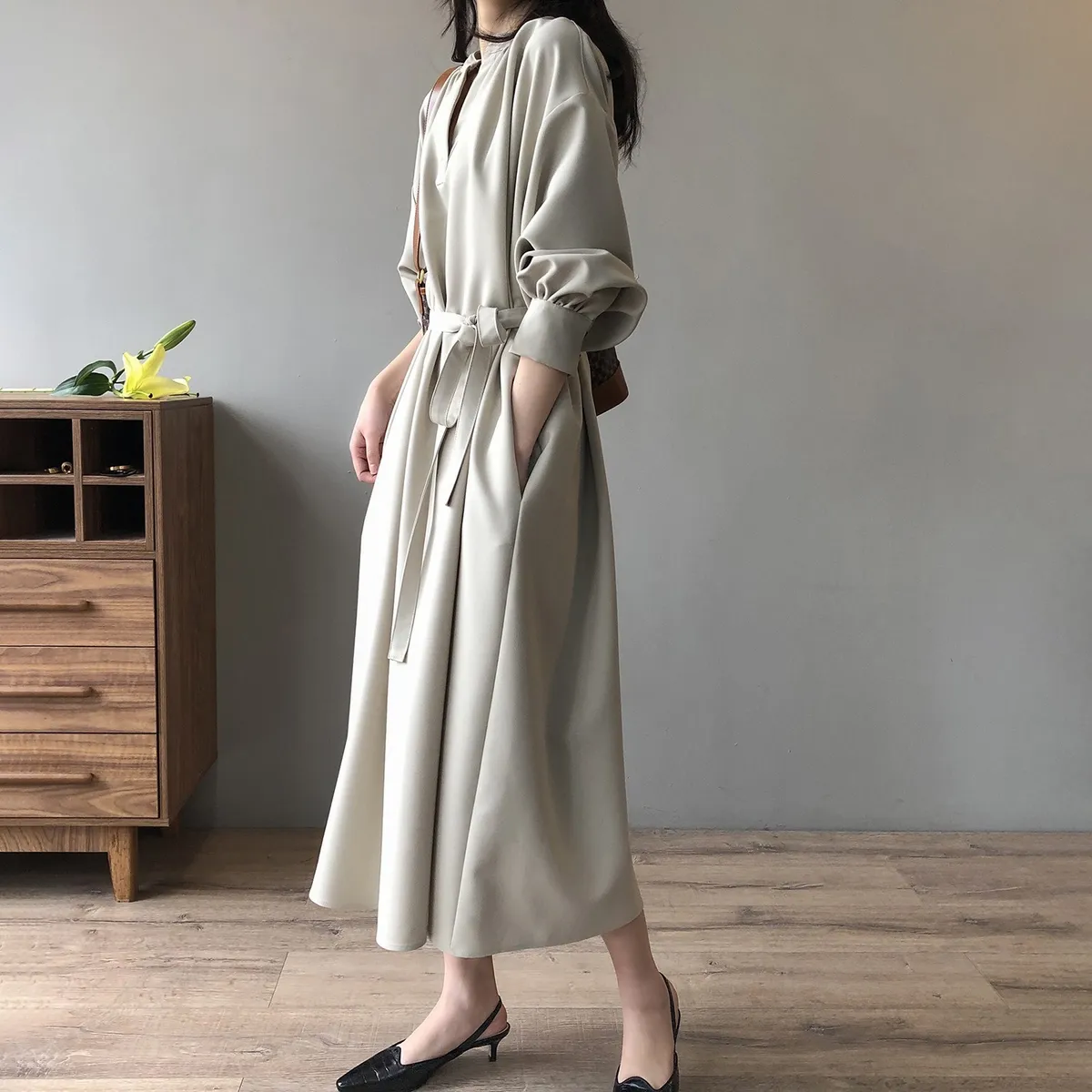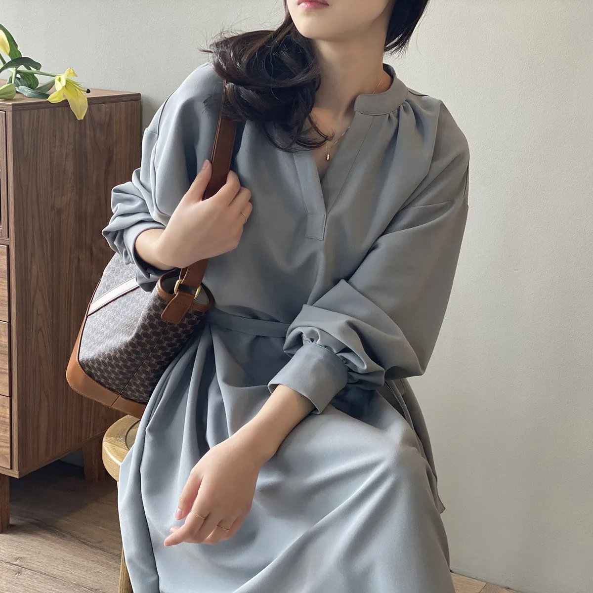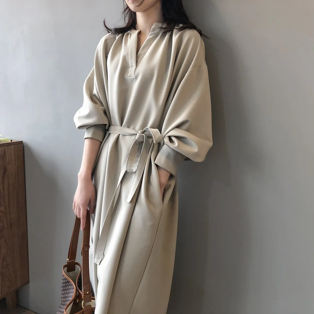 春季V領連衣裙最新韓版寬鬆優雅氣質系帶長款洋裝
