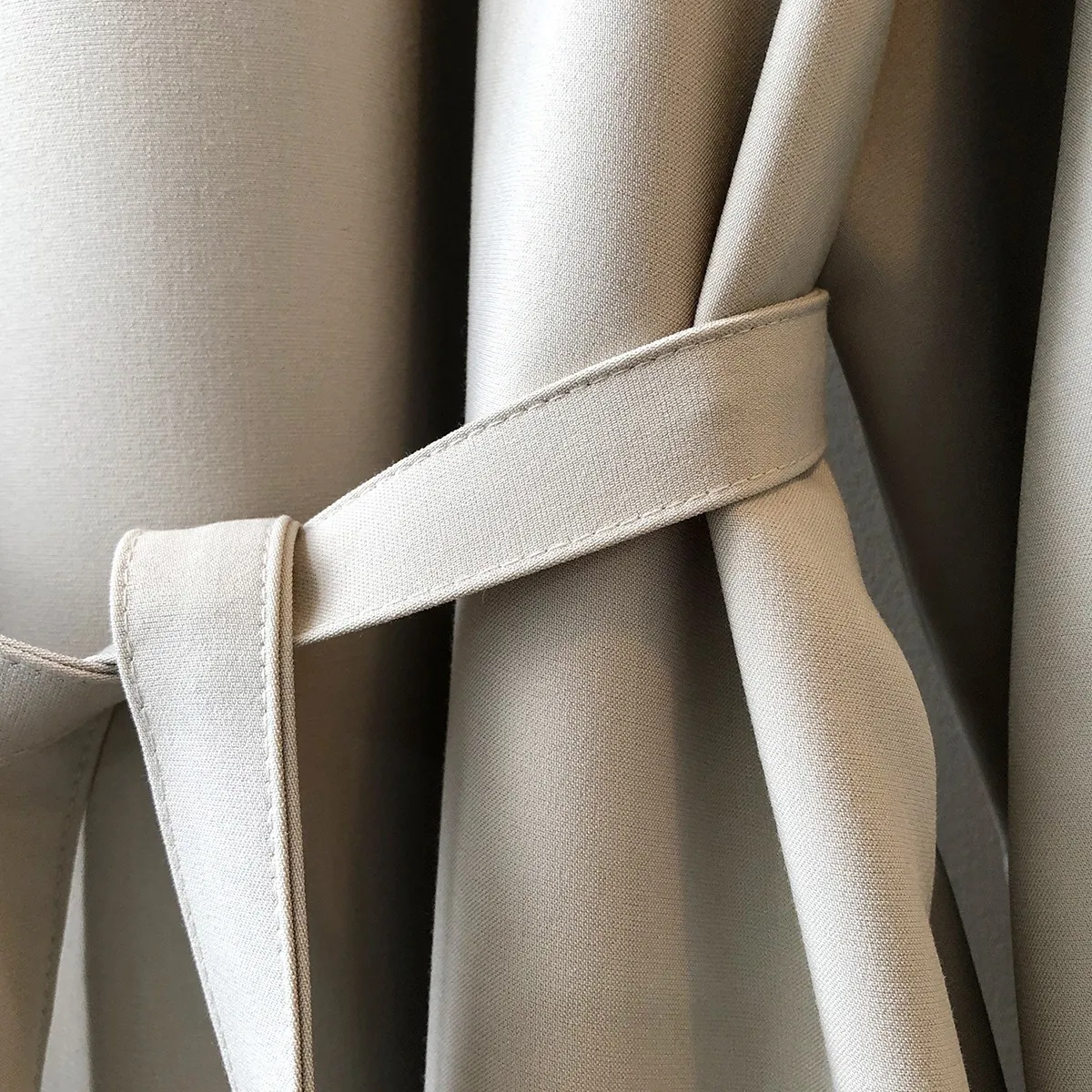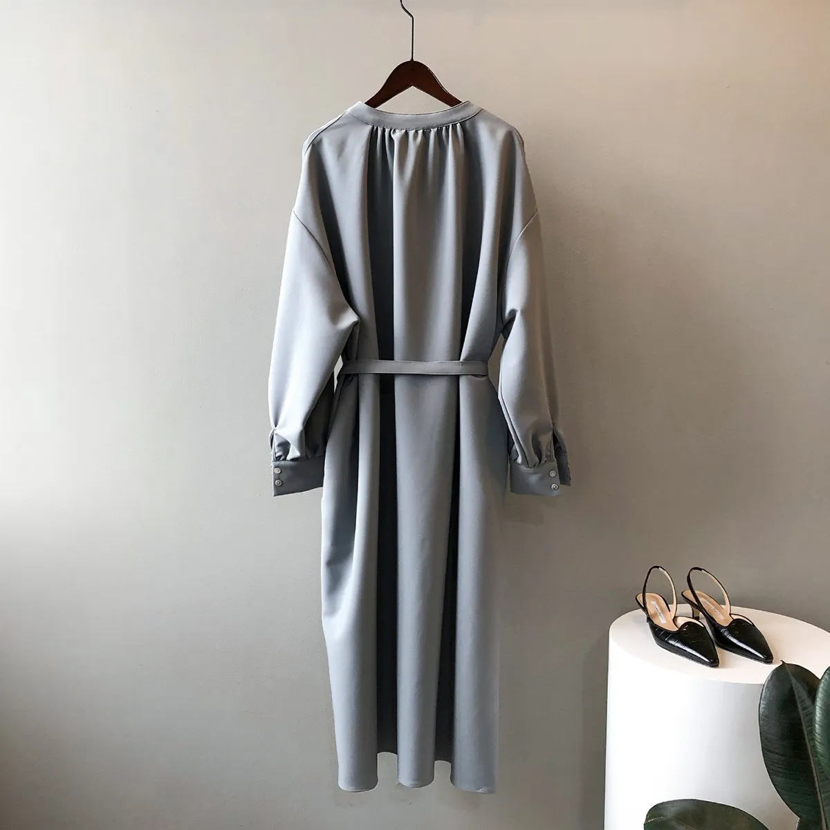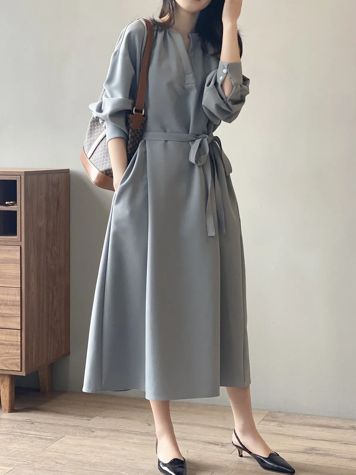 氣質開叉 收腰綁帶 圓領長袖連衣裙