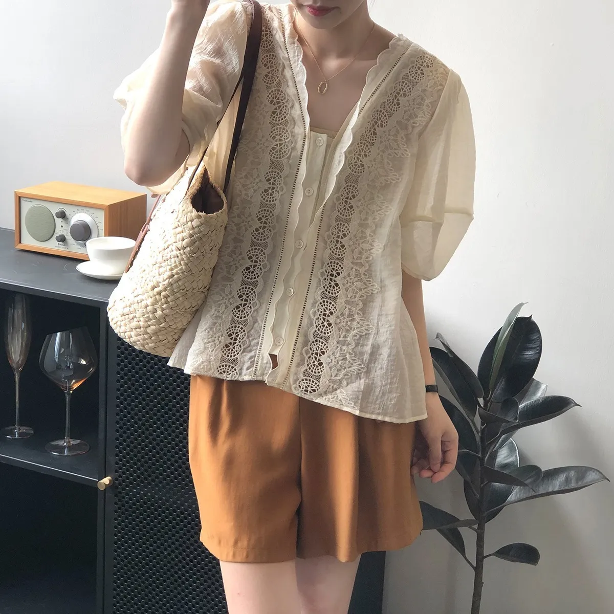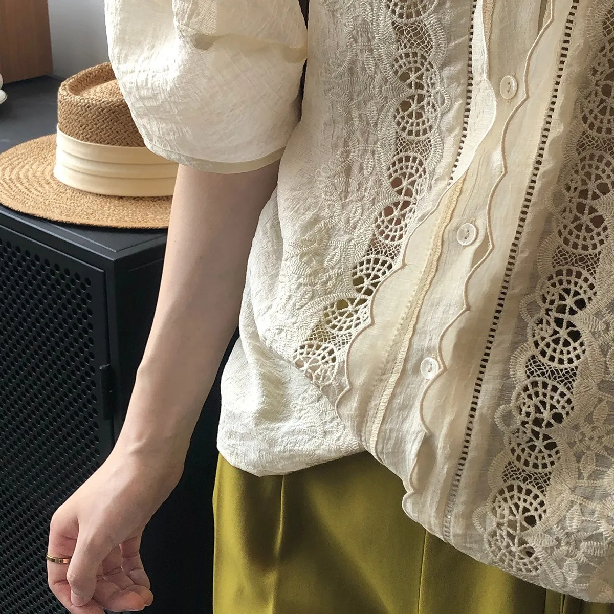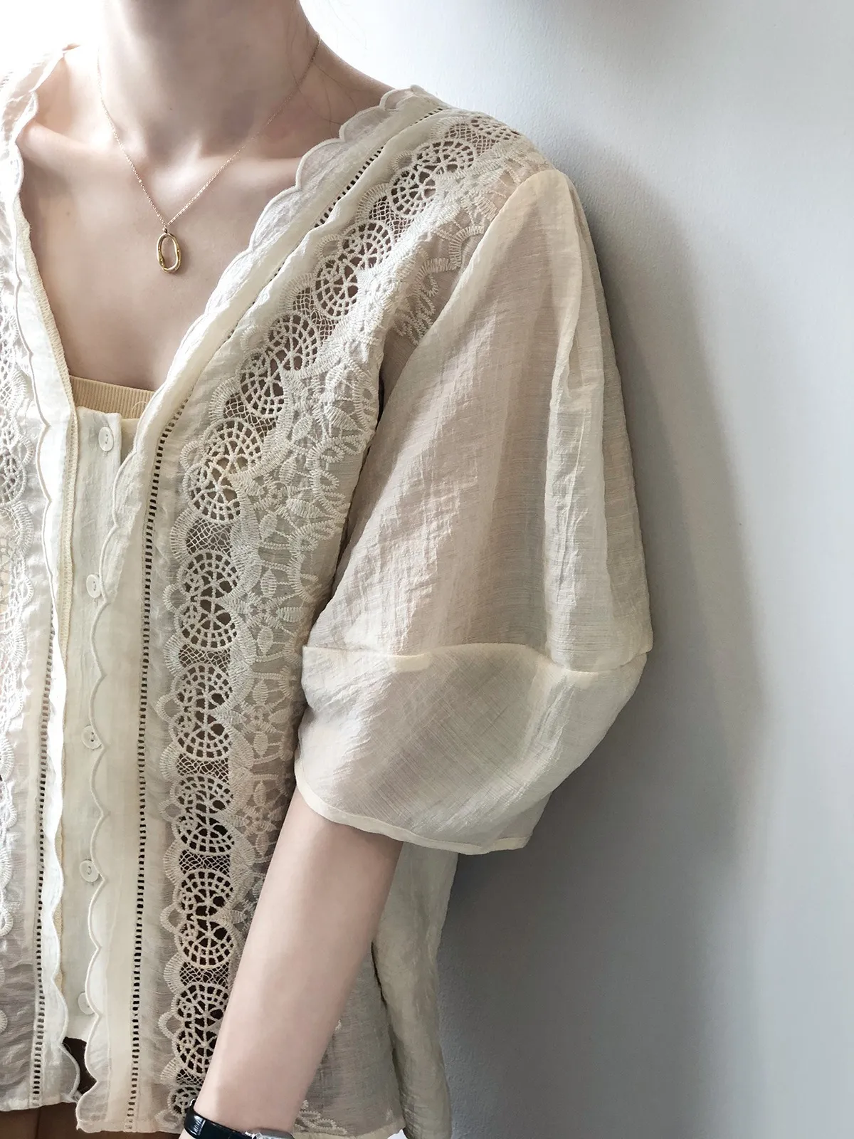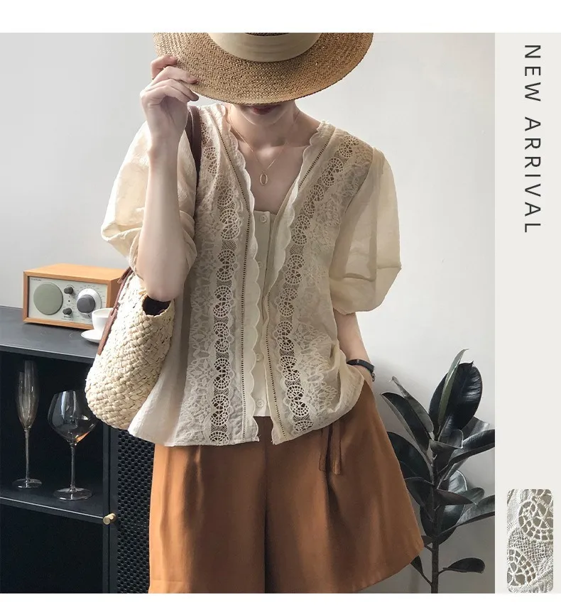 v領泡泡袖襯衫 甜美蕾絲 刺繡鏤空 娃娃衫