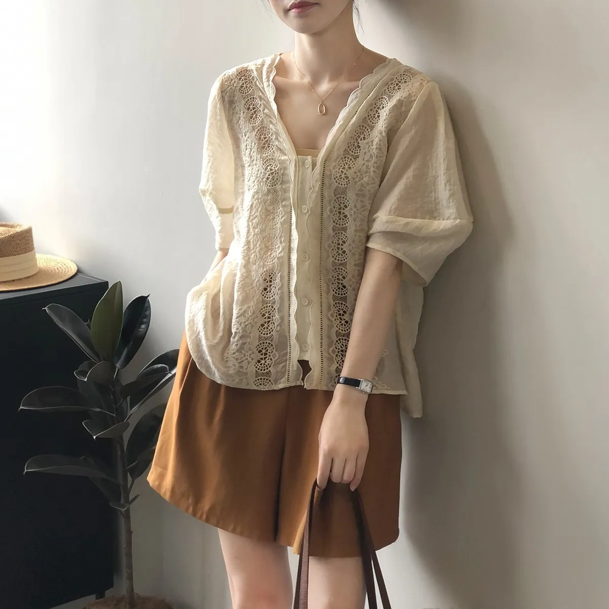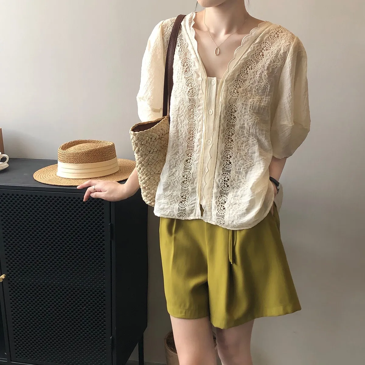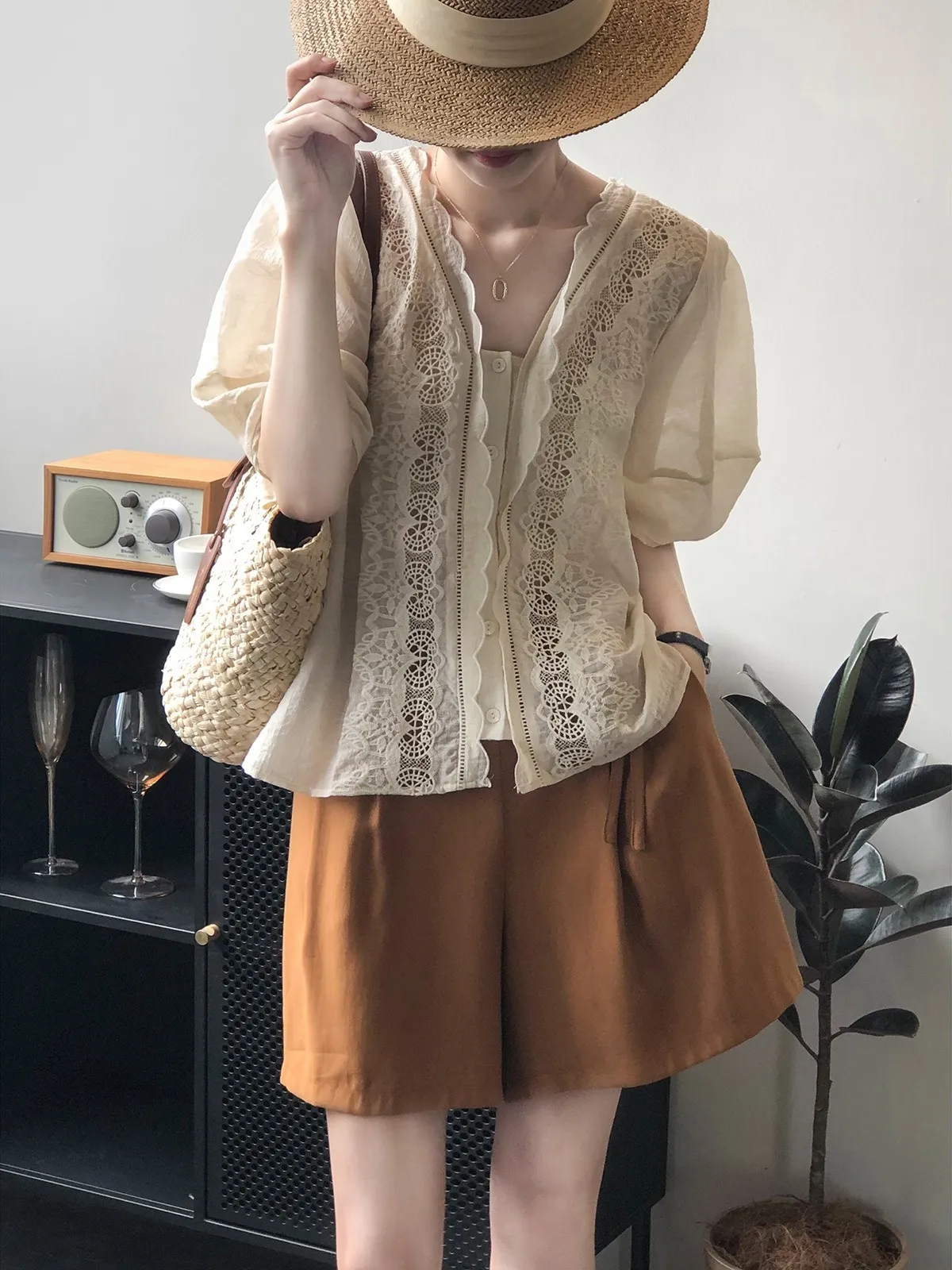 v領泡泡袖襯衫 甜美蕾絲 刺繡鏤空 娃娃衫
