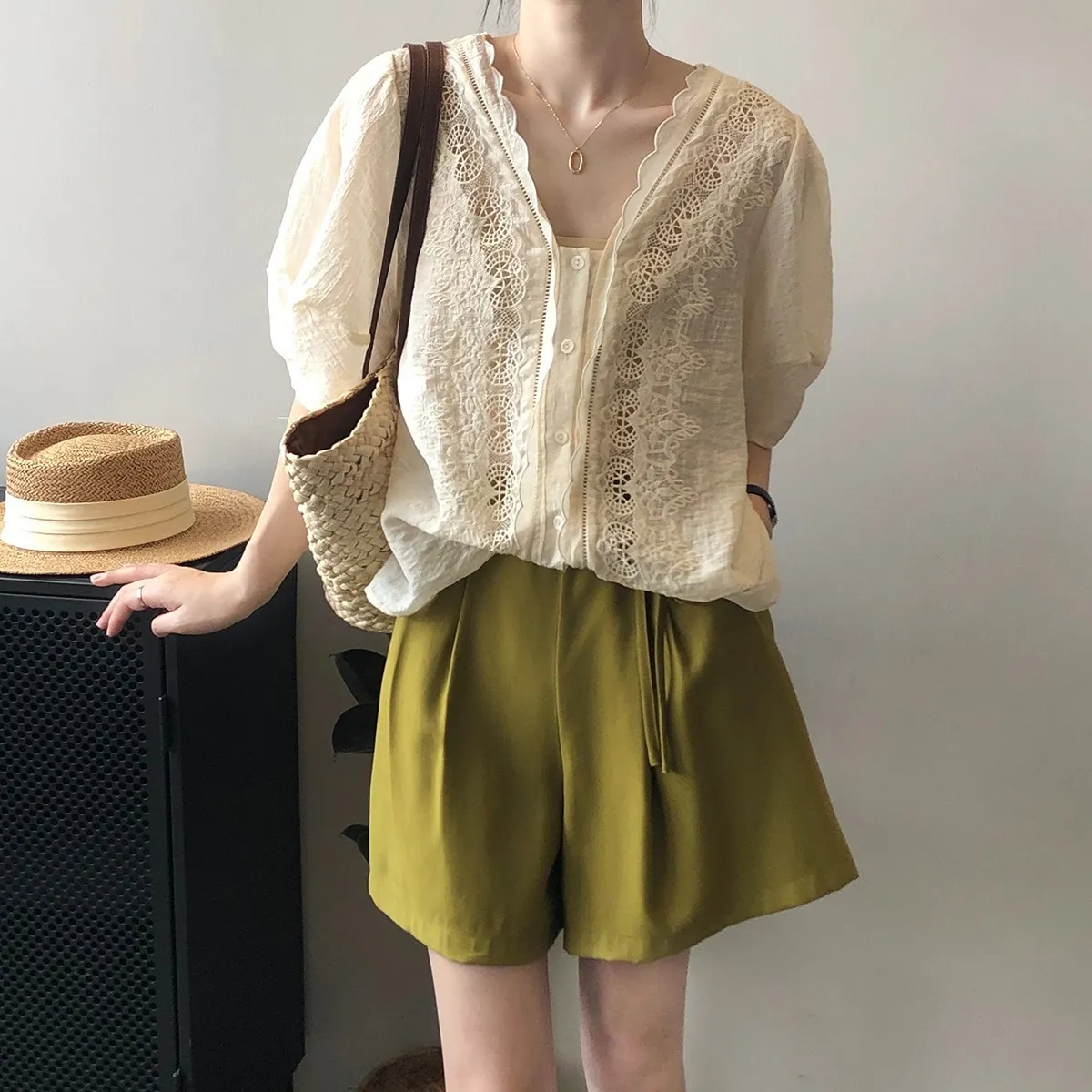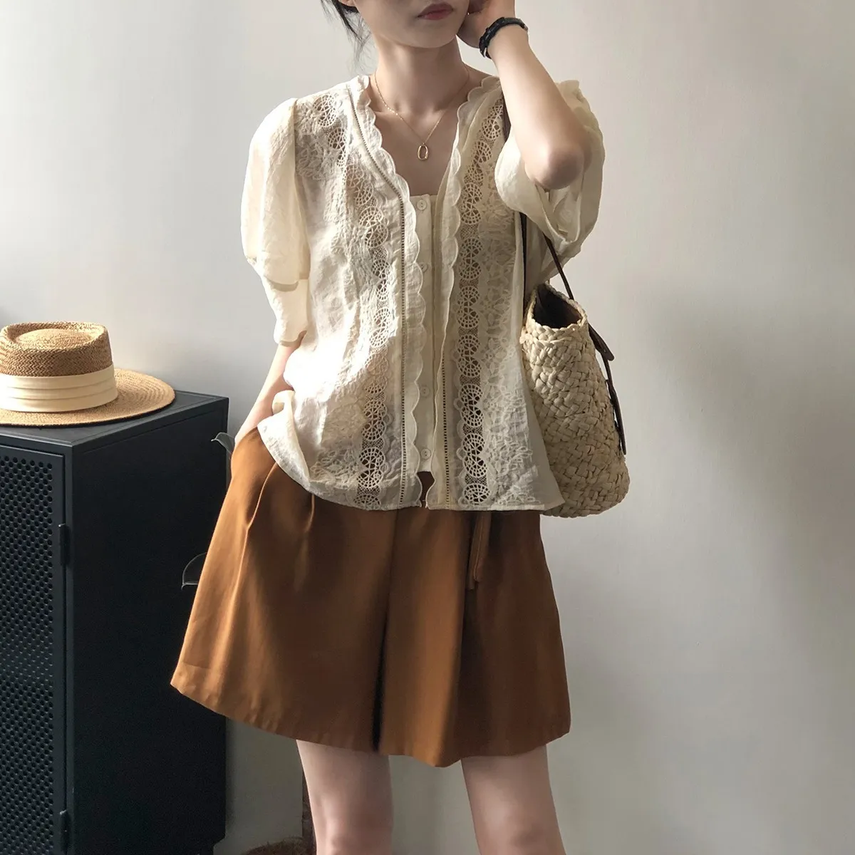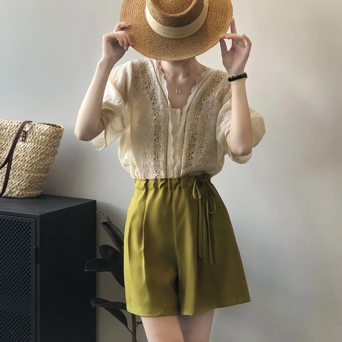 木耳邊襯衫 夏季新款 韓版寬鬆V領 系帶泡泡袖上衣