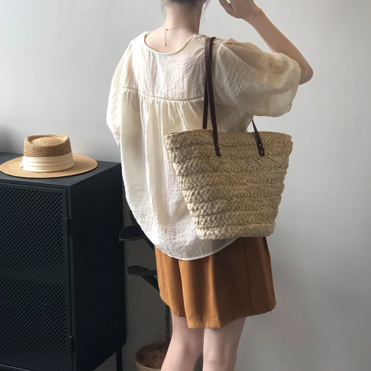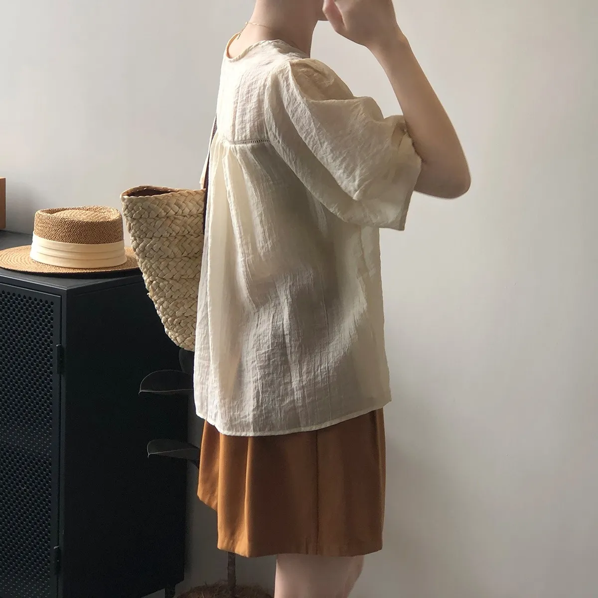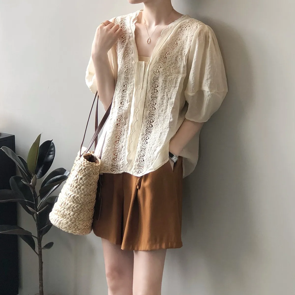 木耳邊襯衫 夏季新款 韓版寬鬆V領 系帶泡泡袖上衣