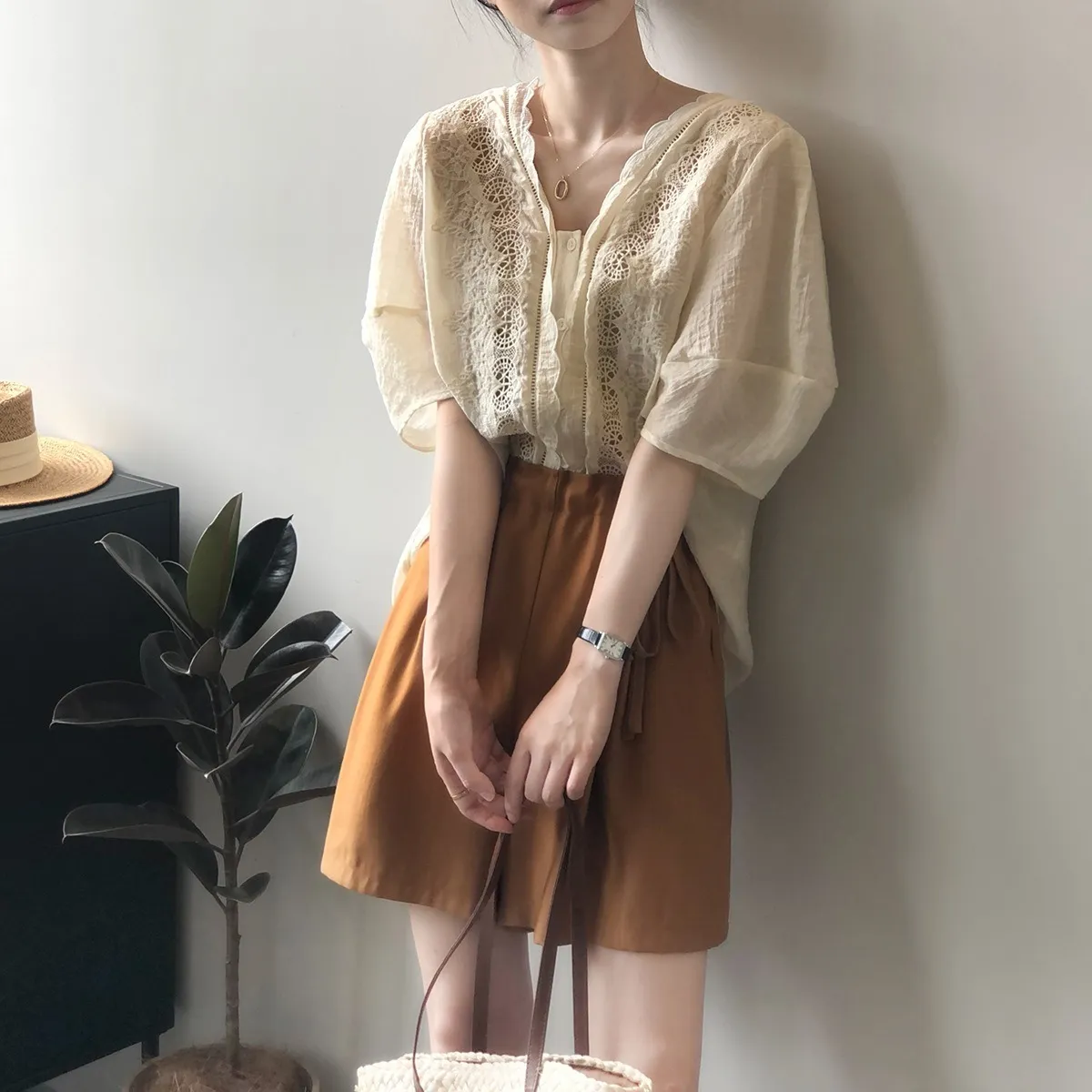 氣質V領襯衫 法式設計感上衣 短袖套頭襯衣