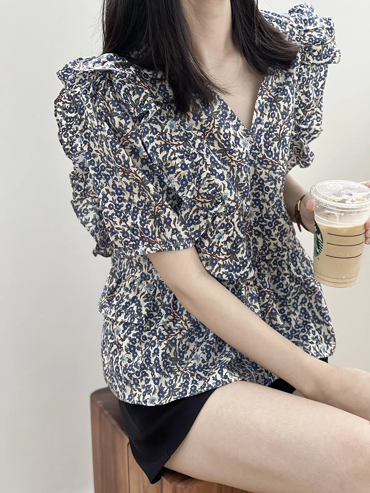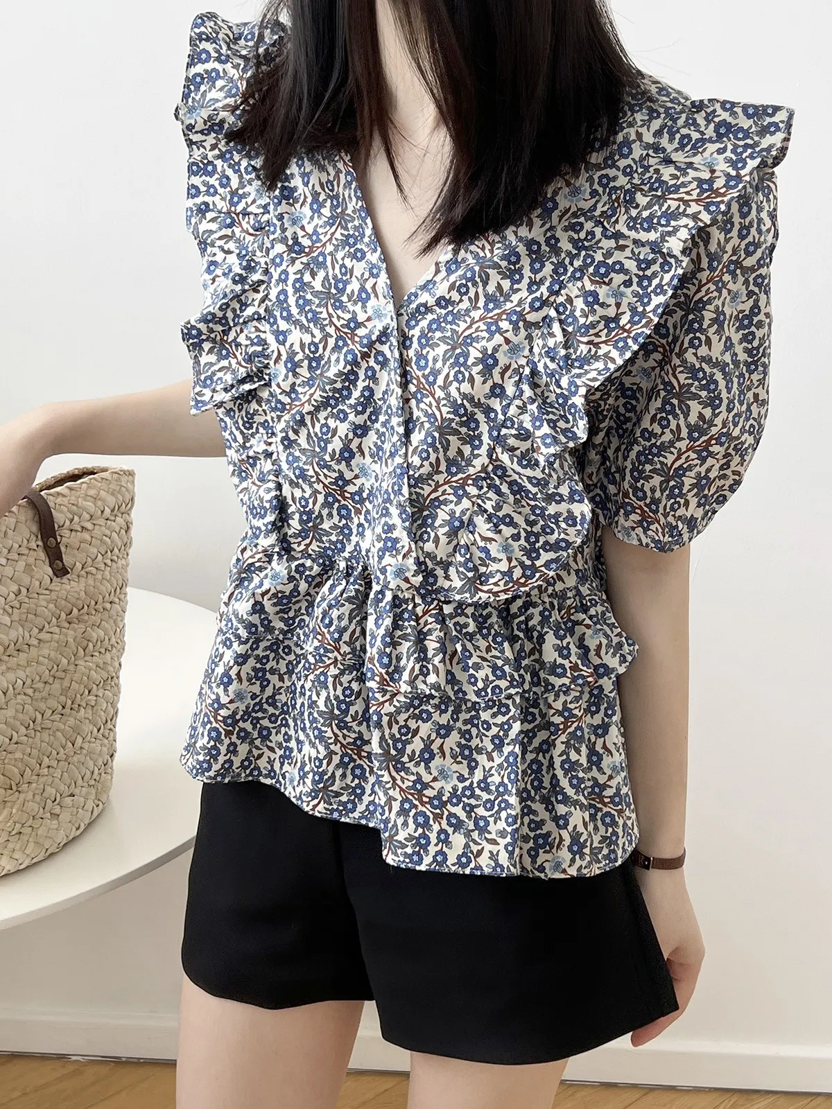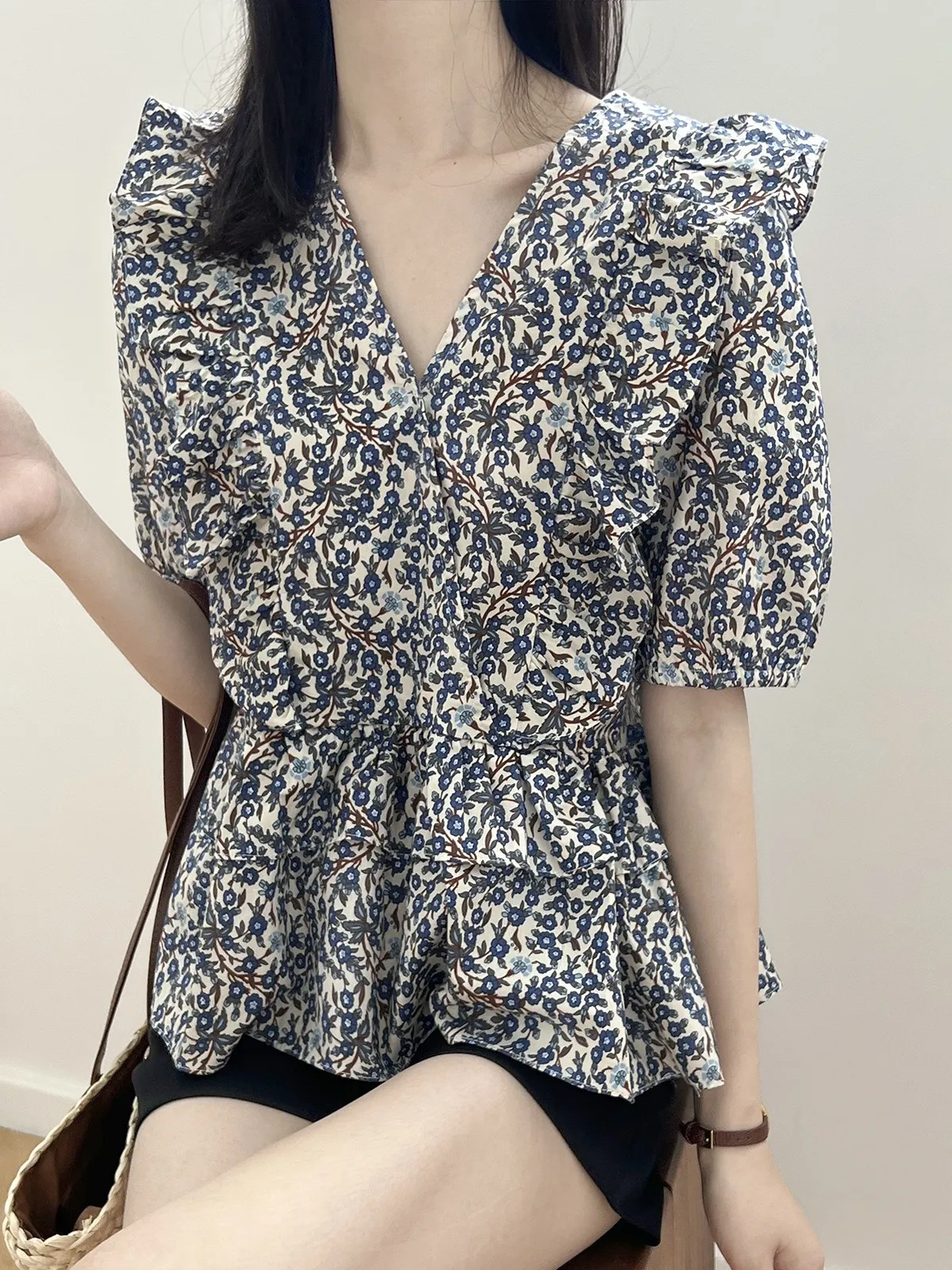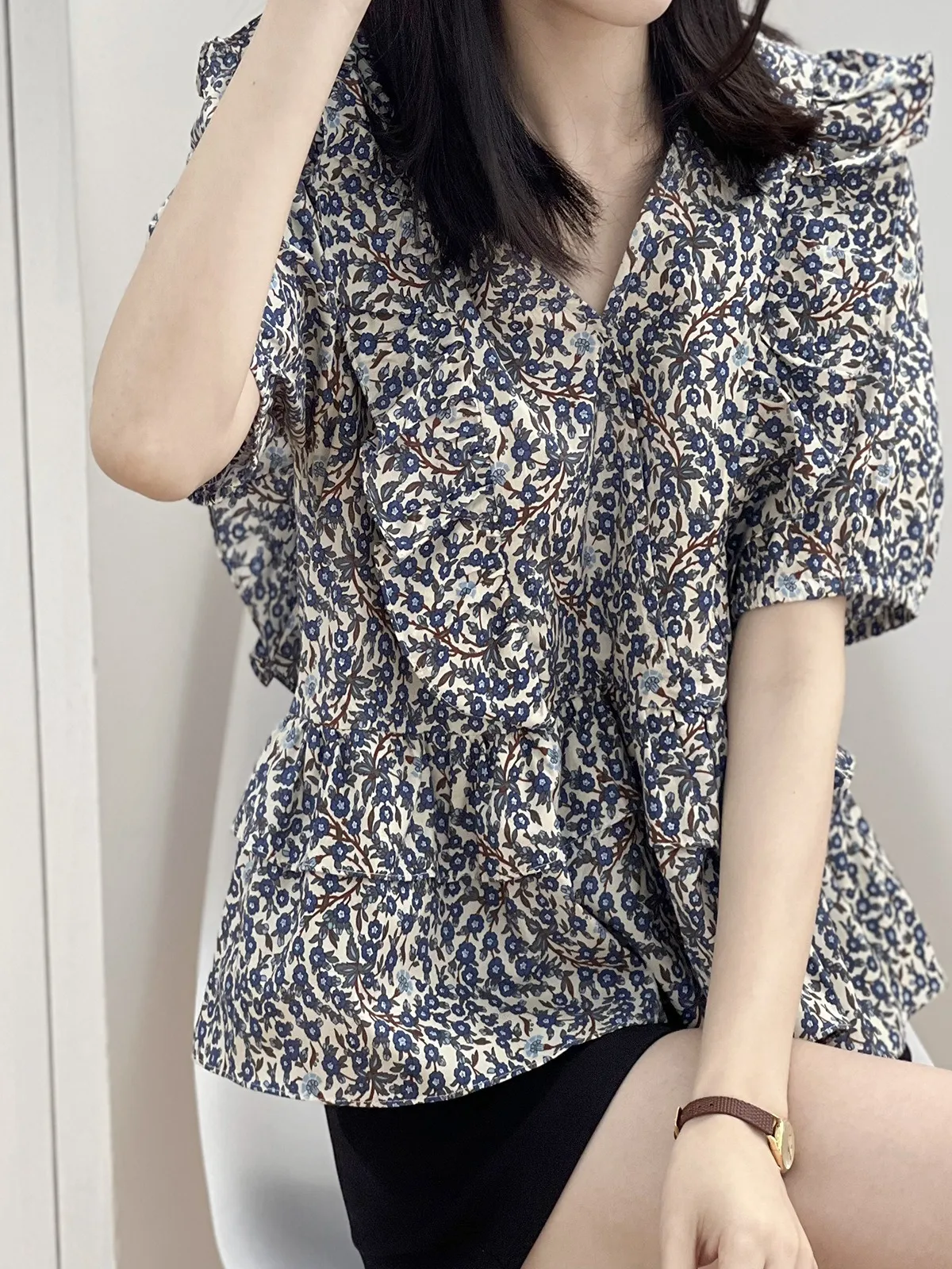 碎花短袖襯衫 夏季新款 設計感V領 荷葉邊上衣