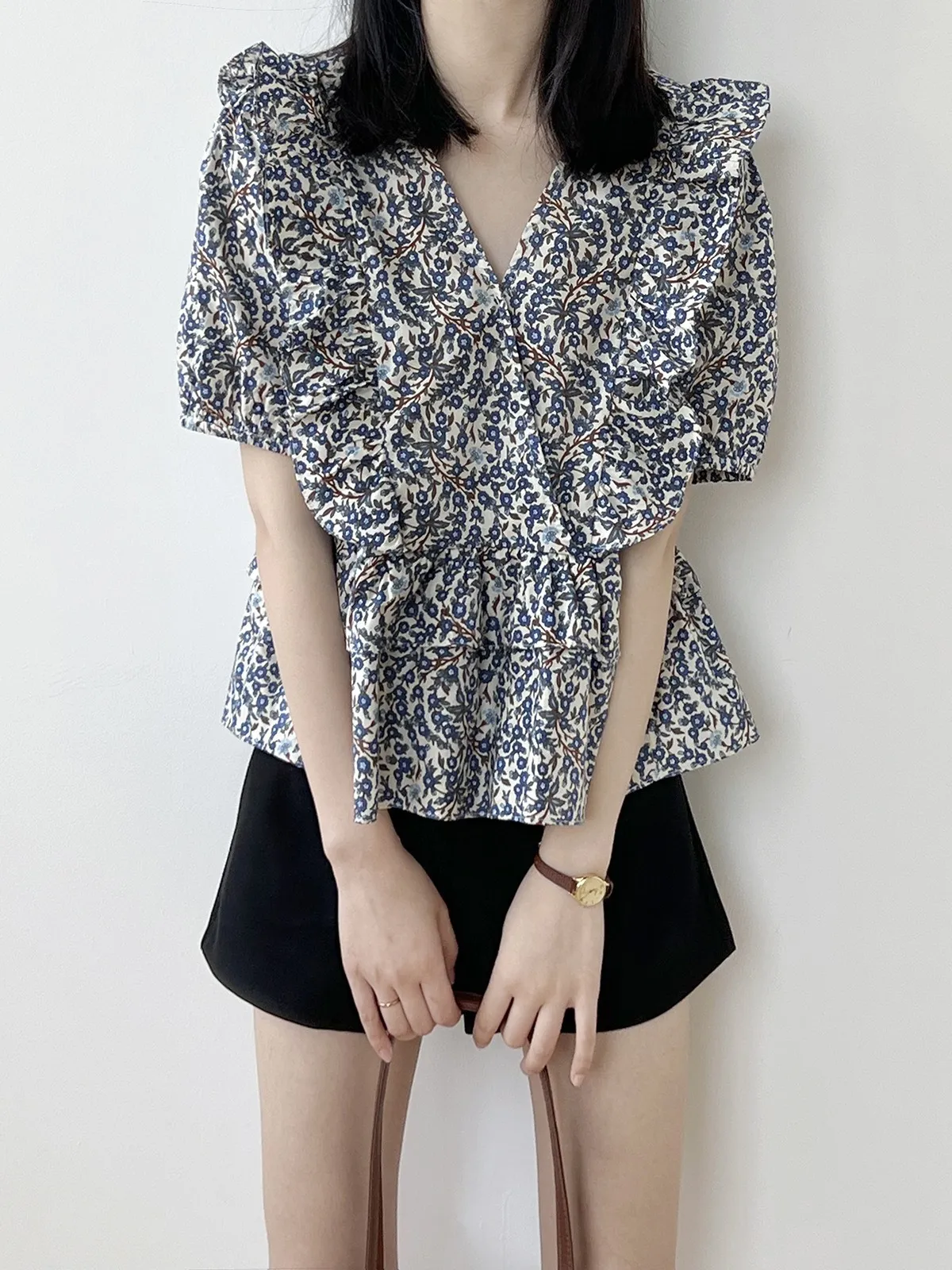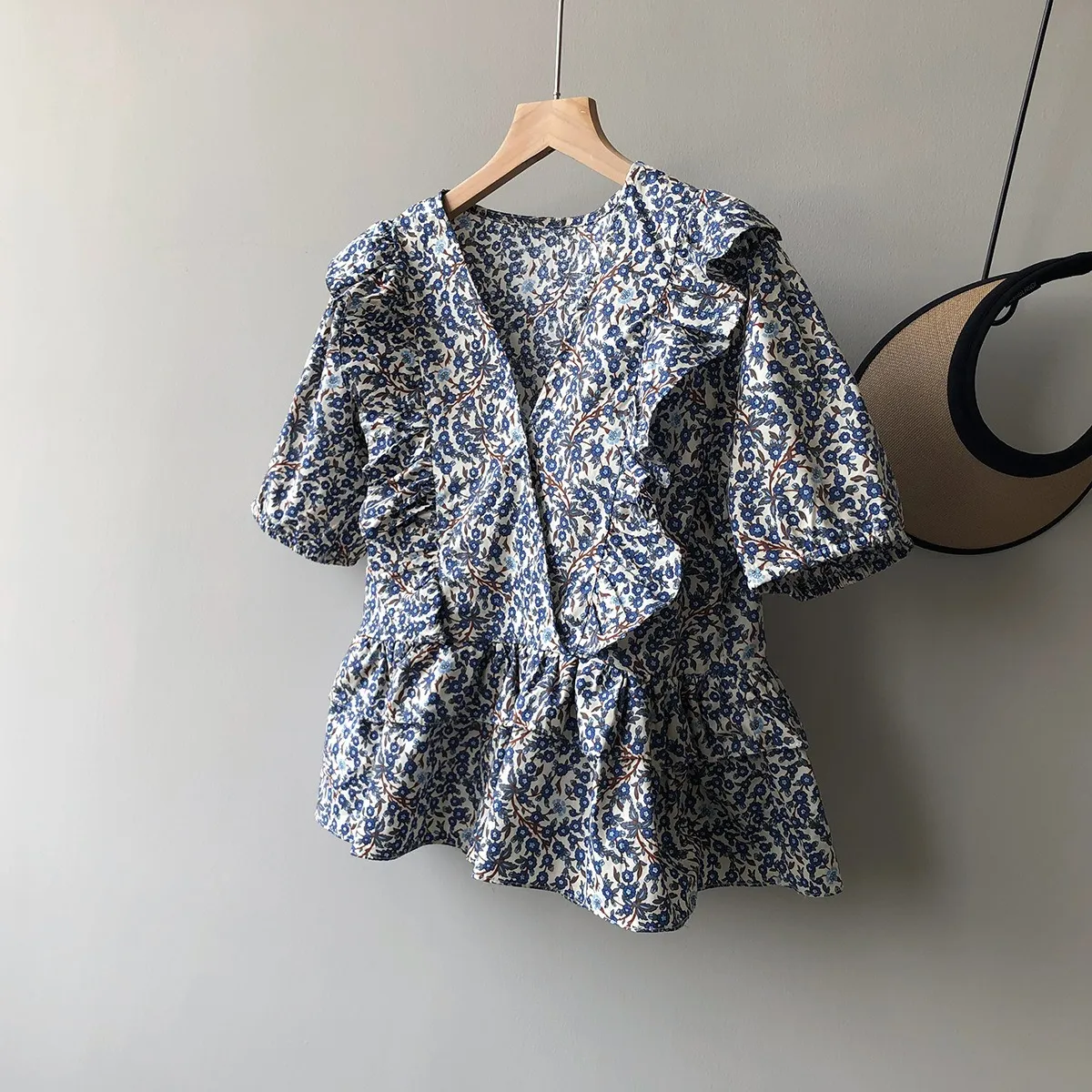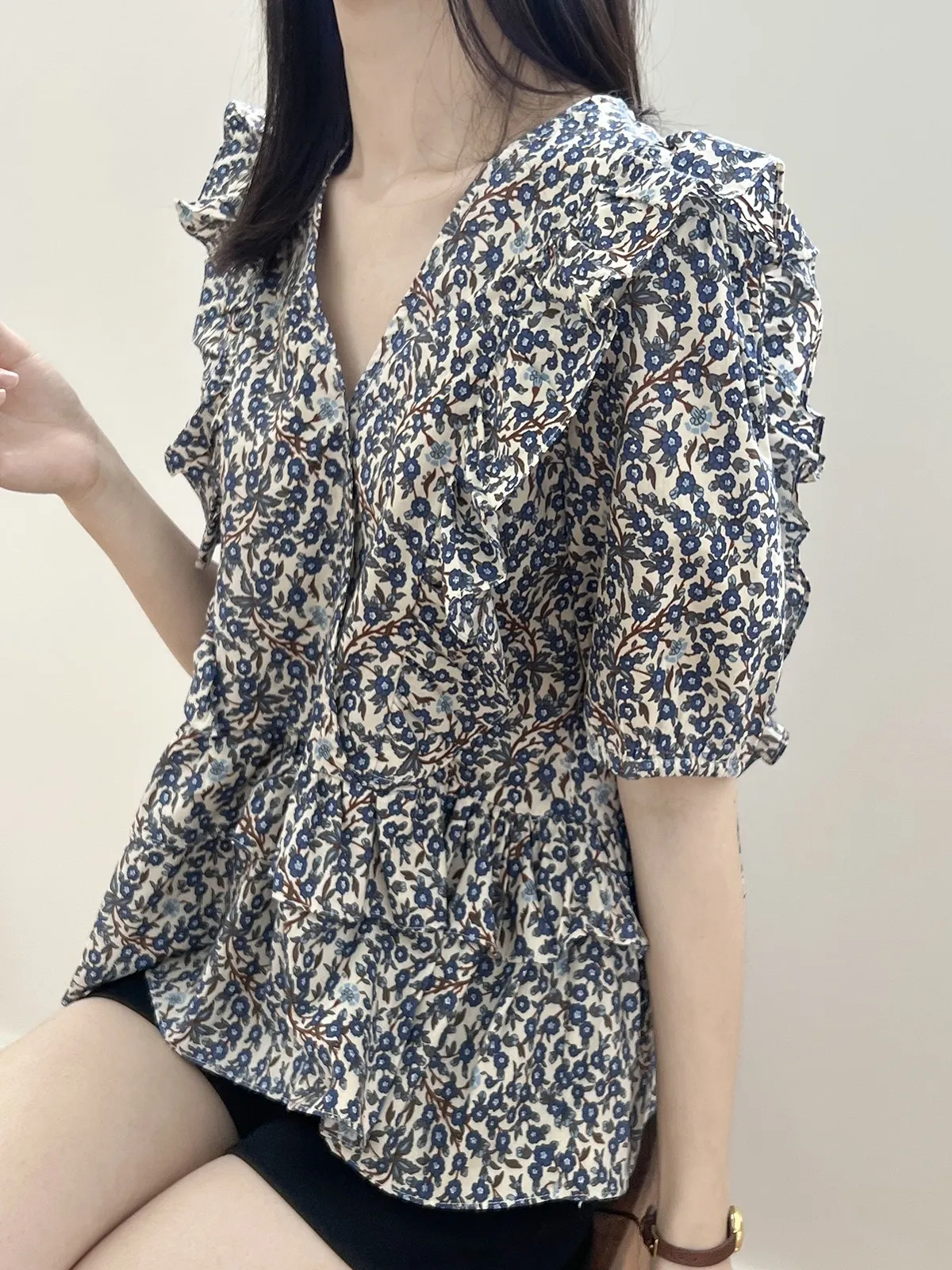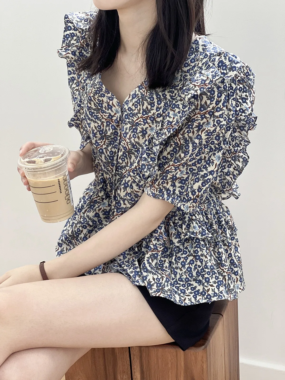 碎花短袖襯衫 夏季新款 設計感V領 荷葉邊上衣