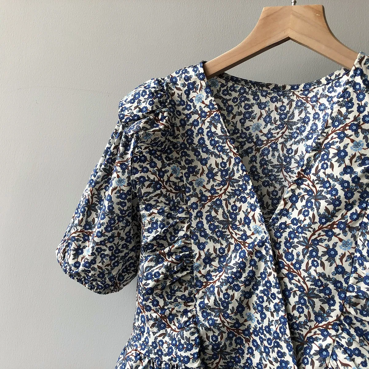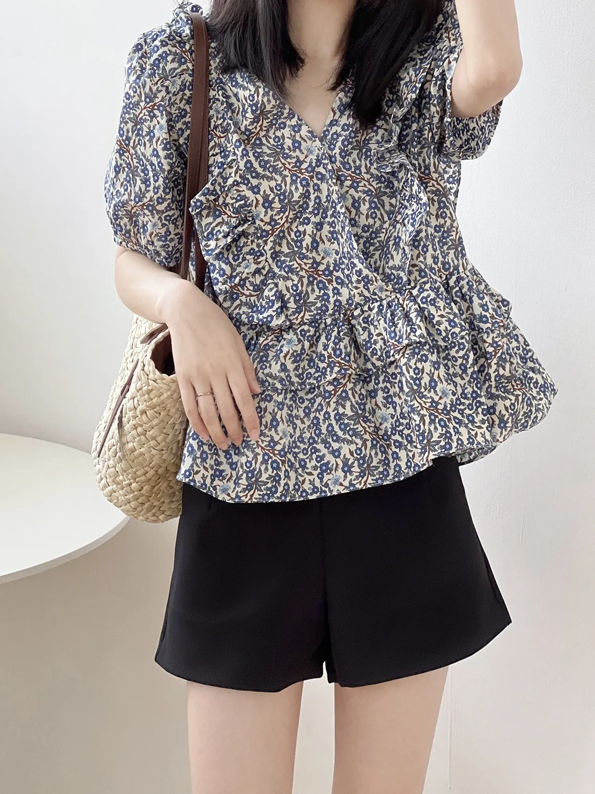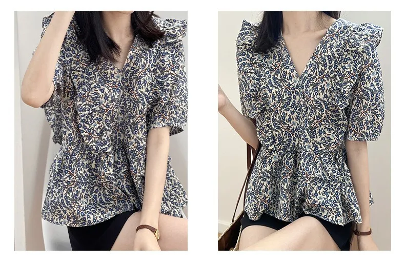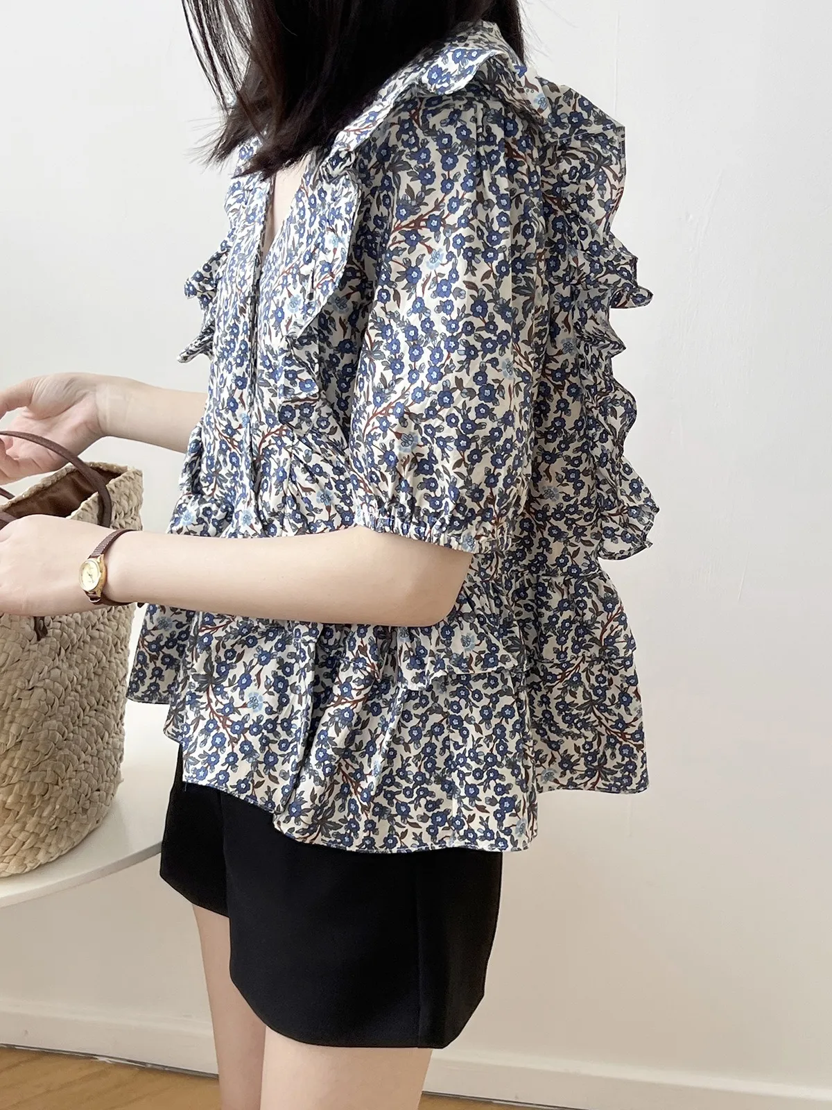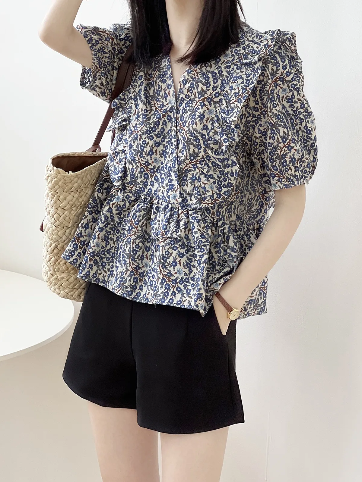 碎花短袖襯衫 夏季新款 設計感V領 荷葉邊上衣