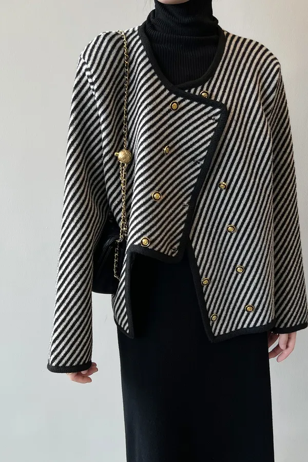 韓版氣質雙排扣斜條紋小香風外套